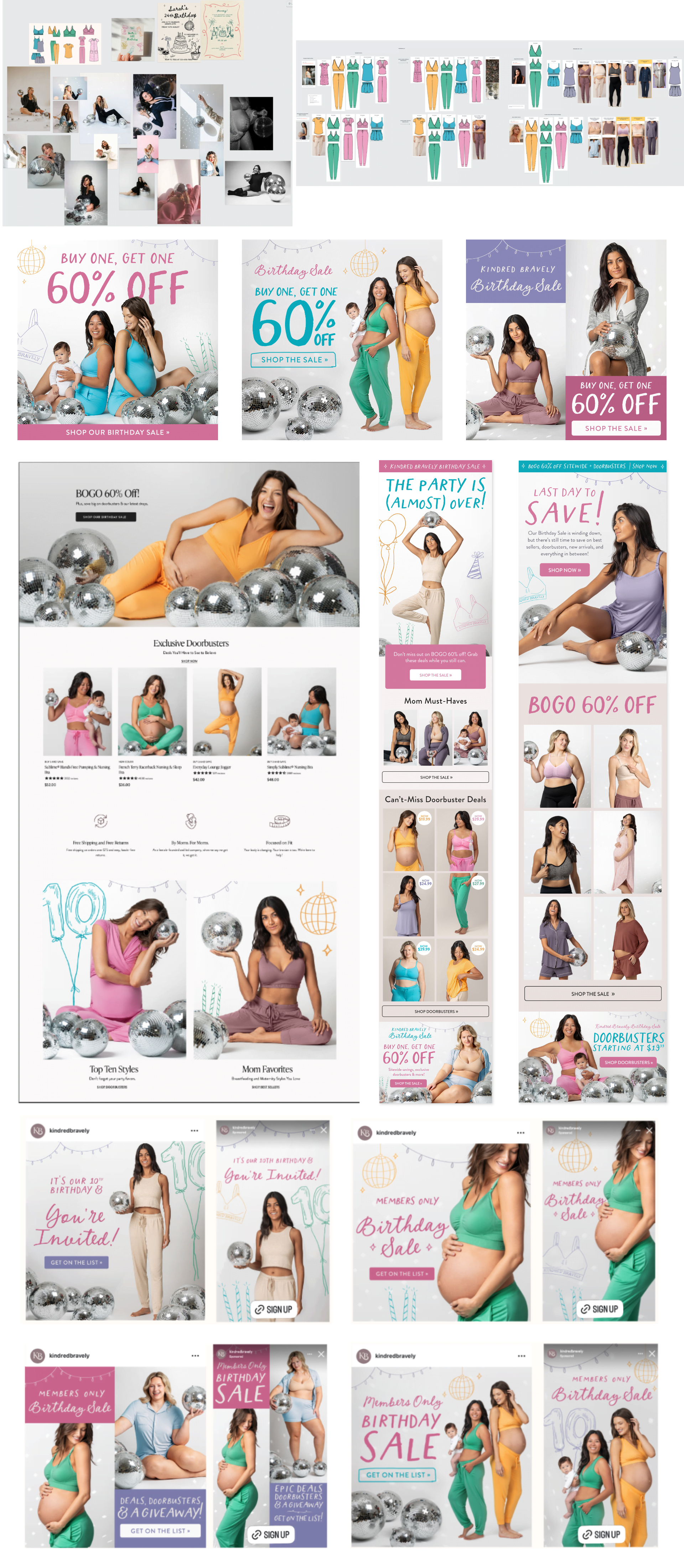 My first major campaign as Creative Director at Kindred Bravely marked the brand’s 10-year anniversary. I developed the concept around disco balls to signal celebration, paired with a clean backdrop to let the vibrant apparel stand out, and incorporated hand-drawn elements to keep the experience playful and welcoming. The campaign became the second highest single-day sales performance in the company’s history.